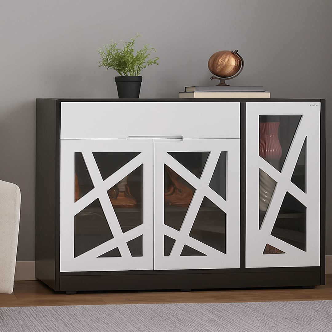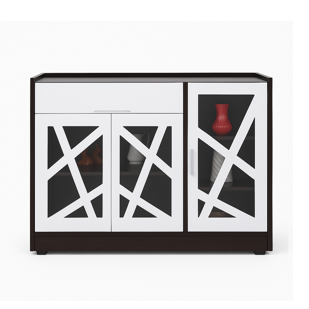 Bring modern elegance and functional charm to your living or dining space with the Hans 48 Sideboard. Designed with a striking Walnut Satin and White Glossy Combo Finish, this compact unit blends seamlessly into contemporary interiors. The standout feature is its intricately designed mesh pattern on the door panels, which adds visual depth while allowing a subtle peek into the contents inside. Whether you’re storing crockery, décor items, or essentials, this sideboard ensures you do it in style.